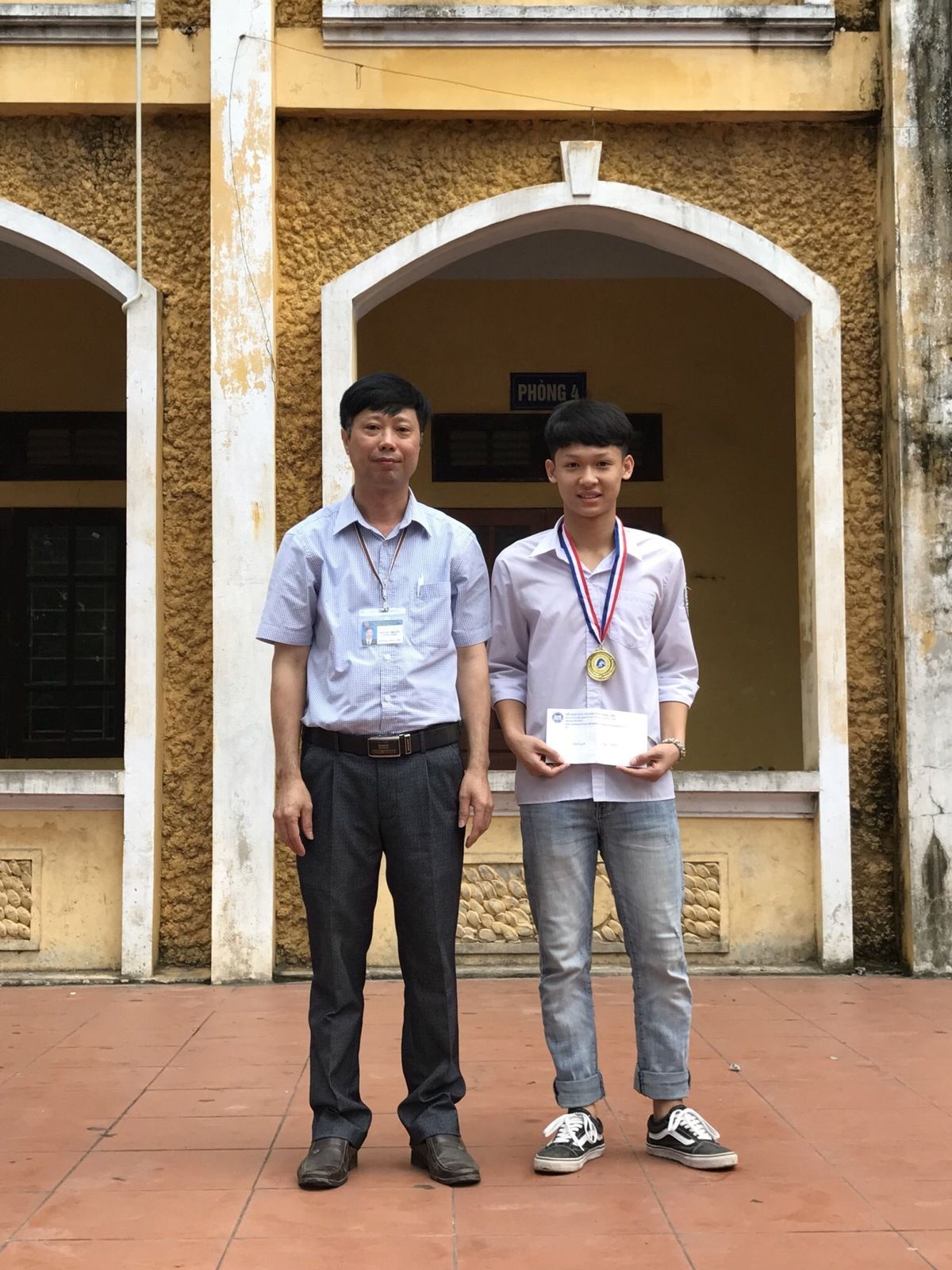 Thầy hiệu trưởng trao giấy chứng nhận cho học sinh đạt danh hiệu HSG huyện và tỉnh.