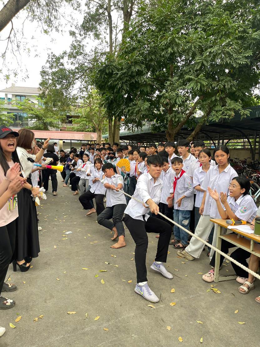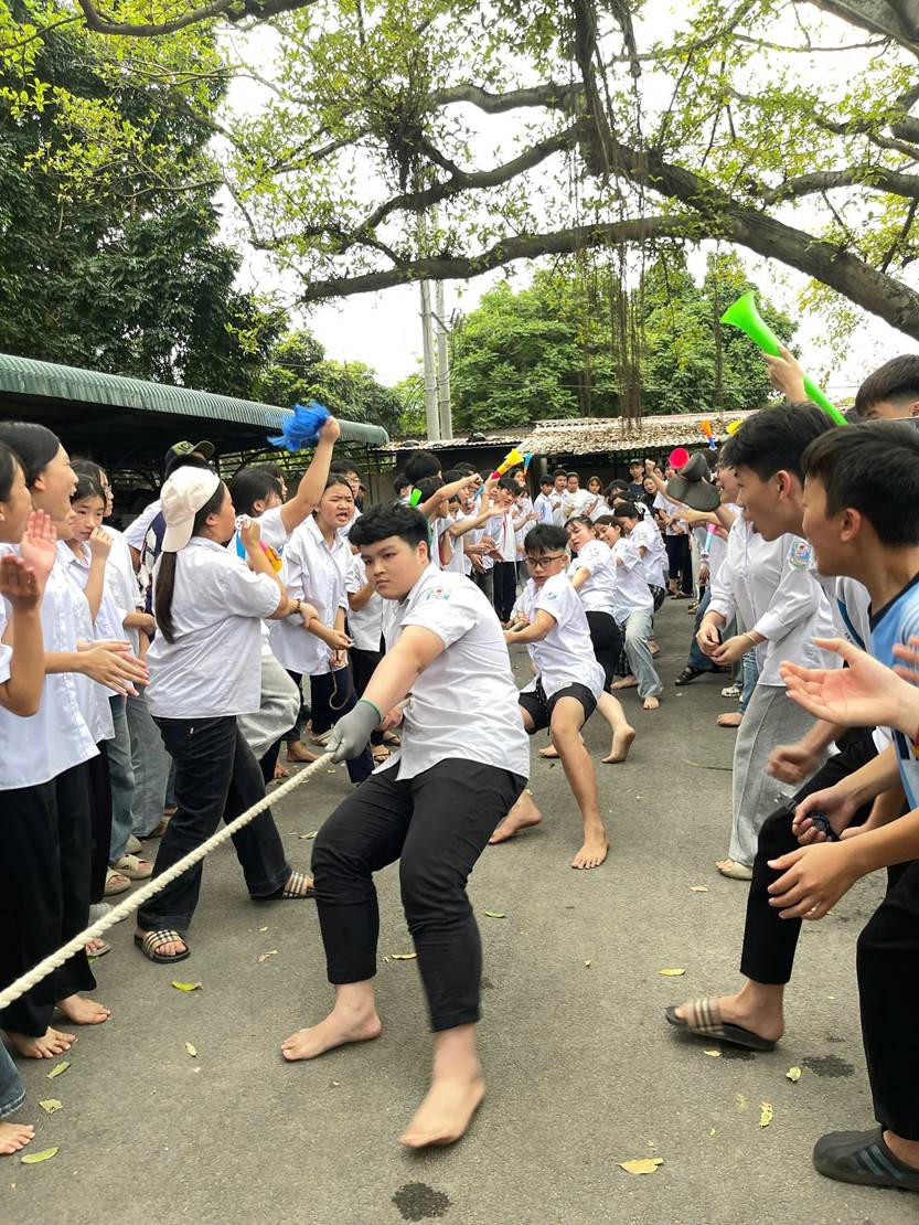 Bên cạnh đó, nội dung kéo co khối 8, 9 đã thu hút sự cổ vũ nhiệt tình của đông đảo học sinh. Những màn tranh tài sôi nổi không chỉ thể hiện sức mạnh mà còn làm nổi bật tinh thần đoàn kết và phối hợp nhịp nhàng giữa các thành viên.